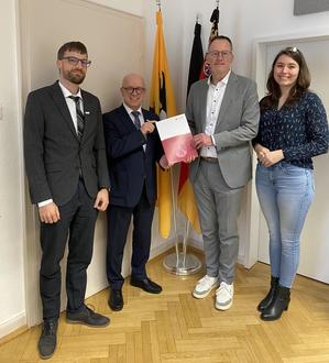Bei der Bescheidübergabe in Boppard (von links): Dominik Nachtsheim, Leiter Fachbereich 5 Stadtverwaltung Boppard, Boppards Bürgermeister Jörg Haseneier, Landesinnenminister Michael Ebling und Boppards Weinkönigin Viktoria Perll.