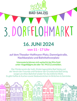 Der 3. Bad Salziger Dorfflohmarkt wird am Sonntag, 16. Juni stattfinden. Zwischen 11 und 17 Uhr können auf den drei zentralen Plätzen (Am Bahnhof, Nachbarplatz und Theodor-Hoffmann-Platz) sowie in den umliegenden Straßen wieder allerlei Schätze aus Keller, Speicher, Kinderzimmer und Garagen zum Kauf angeboten werden.