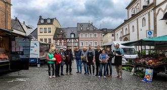 Stadt Boppard - Freitags ist Wochenmarkt in Boppard: Die Marktbeschickerinnen und Marktbeschicker gemeinsam mit Boppards Bürgermeister Jörg Haseneier.