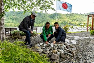 Stadt Boppard - Auch der Bürgermeister von Ome, Keiichi Hamanaka (Mitte), und Masayoshi Kusano, Abteilungsleiter für internationale Beziehungen bei der Stadt Ome (rechts), haben bei ihrem Besuch in Boppard Steine aus dem Tama-Fluss beschriftet und im Partnerschaftsgarten niedergelegt.