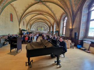 Bürgermeister, Gäste, Musiker und Kümmerer beim Erinnerungsfoto