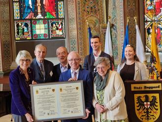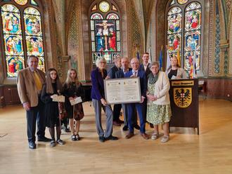 Bürgermeister Jörg Haseneier nimmt die Urkunde zum 35-jährigen Bestehen der Städtepartnerschaft entgegen