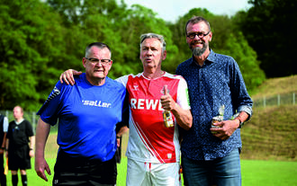 Der Geschäftsführer der Stiftung Bethesda und der Firma Best, Stefan Feld (re.); 1. FC Köln Legende Stephan Engels und der Organisator des Spiels und Trainer der Bethesda Elf, Eric Fischer