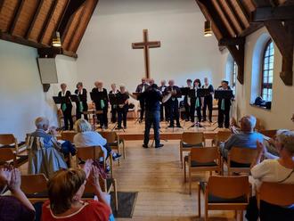 Im Mittelpunkt des Konzertes, in dem der Chor bekannte Lieder wie „Lass die Sonne in dein Herz“ oder „Wellerman“ zu Gehör brachte, stand das gemeinsame Singen mit den Zuhörerinnen und Zuhörern. Auf diese Weise erklangen Volkslieder, aber auch Hits wie „Griechischer Wein“ oder „We Are the World“ aus vielerlei Kehlen in der gut besuchten evangelischen Kapelle. „Das macht richtig Spaß mit ihnen allen zu singen, demnächst gehen wir gemeinsam auf Tour“, scherzte Chorleiter Tobias Querbach im Verlauf des Konzerts. „Das Experiment ist geglückt!“, resümierte der Vorsitzende Burkhard Höhlein, der auch durch das Programm führte, in seinen Schlussworten. „Wir werden das wiederholen, vielleicht sogar eine Tradition daraus machen.“ Mit rheinischen Weinliedern vor den Toren der Kapelle fand das Konzert bei Gebäck und einem guten Tropfen aus dem Bopparder Hamm seinen gemütlichen Ausklang.