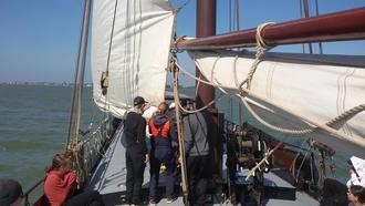 Dabei halfen zwei einem Hund wieder an Land zu finden, der die Orientierung verloren hatte. Die Ruhe und meditative Stimmung des Segelns erlebte die Gruppe auf der Rückfahrt nach Muiden. Mit leichtem Wind und gesetztem Segel gleitete die Nieuwe Zorg gemächlich über das Wasser. In Muiden angekommen, galt es sich auf die Abreise am kommenden Vormittag vorzubereiten. Hierzu gehörten auch das Schruppen des Decks und ein letztes warmes Abendessen.