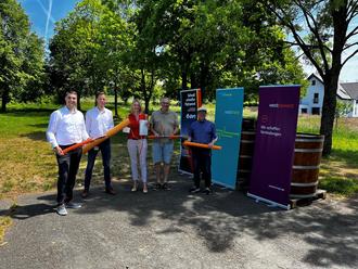 Bildunterschrift: (v.l.n.r.) Florian Schmidt, Westenergie-Regionalmanager, Simon Rietz, Projektleiter bei Westnetz, Sandra Porz, Ortsvorsteherin, Walter Remahne, Ortsbeirat Udenhausen, Jörg Haseneier, Bürgermeister der Stadt Boppard, beim Baustart in Boppard-Udenhausen