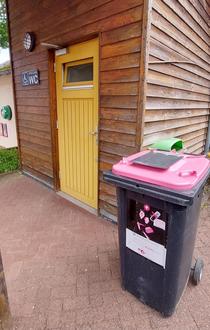 Die Tonne befindet sich nun an der Rheingoldstraße neben der öffentlichen Toilette.