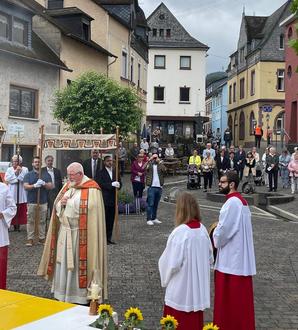 Der Musikzug der Freiwilligen Feuerwehr verlieh der Prozession einen besonderen Glanz. Viele Menschen trugen auch in diesem Jahr dazu bei, dass Fronleichnam in Bad Salzig ein Fest des Glaubens wurde: die Freiwillige Feuerwehr, die den Prozessionsweg sicherte, die Messdiener, Vorbeter und Vorsänger sowie die Himmelsträger. Viele Anwohner entlang des Prozessionsweges schmückten ihre Häuser. Mit dem Ägidiuslied, das nach dem Schlusssegen in der St. Ägidiuskirche gesungen wurde, endete die Prozession. Pastor Hermann-Josef Ludwig zelebrierte den Festgottesdienst und spendete den Segen.