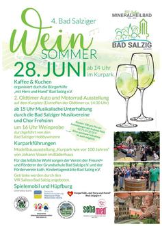 Am Samstag, 28. Juni findet ab 14 Uhr der 4. Bad Salziger Weinsommer im Kurpark statt - im Jubiläumsjahr “100 Jahre Bad Salzig” mit Oldtimertreffen auf dem Kurplatz, der Modellbauausstellung „Kurpark wie vor 100 Jahren“ von Johann Vosen im Bäderhaus und Kurparkführungen. Zu Kaffee und Kuchen (bitte Tasse mitbringen!), organisiert durch die Bürgerhilfe mit Herz und Hand, erwartet Sie musikalische Unterhaltung mit den Bad Salziger Musikvereinen und dem Chor Frohsinn. Bei der Weinprobe ab 16 Uhr stellen die Hobbywinzer besondere Weine ähnlicher Initiativen vor (6er Probe, 10 € pro Person, Anmeldung unter 0171 3137039). Bier- und Weinstand werden vom VfR Salisso betrieben, herzhafte Speisen bieten die Fördervereine von Kita und Grundschule an. Herzliche Einladung!
