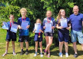 Matilde Leonards, Linus Schmahl, Marta Leonards, Hannah Hagedorn, Leonie Goldberg und Betreuer Thomas Goldberg
