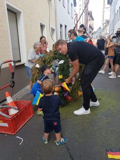 Beim traditionellen Abspielen der Kirmeskronen der Ritter-Beyer Nachbarschaft Boppard gab es zur Freude der vielen Kinder viele Spielsachen im Innern der Kronen. Gemeinsam mit Nachbarmeisterin Heidy Becker gab es für mich die Nadeltaufe bei sonnigem Wetter und leckerem Wein.