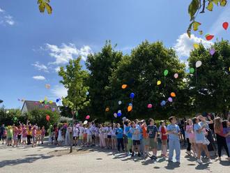Nach persönlichen Worten voller Stolz, Dankbarkeit und guten Wünschen der Schulleiterin Frau Weinand an die Viertklässlerinnen und Viertklässler folgte ein besonderer Höhepunkt der Feier: das Steigenlassen der bunten Luftballons auf dem Schulhof. Mit allen guten Wünschen und Hoffnungen ließen die Kinder zuletzt die Luftballons in den Himmel steigen. Ein Symbol für Aufbruch sowie Hoffnung und auch die Klassenlehrerinnen machten mit. Ganz in dem Gedanken: „Wir lassen euch nun los – aber nur, damit ihr fliegen könnt.“