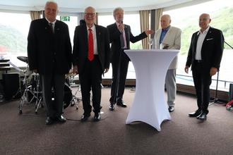 Die beiden Past-Governor Hanns-Otto Strumm (links) und Wolfgang Ernst (rechts) dankten für den Distrikt Mitte-Süd gemeinsam mit dem scheidenden Club-Präsidenten Dieter Böhres (Mitte) den Gründern Prof. Dr. Arno Alt, Oberwesel (zweiter von links), Peter Boldt, Boppard (zweiter von rechts) und Elmar Röhl, Boppard, der leider nicht teilnehmen konnte.