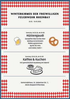 Die erste Veranstaltung im neuen Jahr ist vom 24. bis 25. Januar unsere traditionelle Winterkirmes im Dorfgemeinschaftshaus in Rheinbay. Unter dem Motto „Hüttengaudi“ richtet unsere Freiwillige Feuerwehr Rheinbay diese Kirmes aus, dafür ein großes Dankeschön. Los geht es am Samstag um 19:00 Uhr und am Sonntag um 15:00 Uhr. Freut Euch auf gute Stimmung, Musik und leckere Köstlichkeiten sowie viele schöne Momente. Kommt bitte vorbei und unterstützt unsere Freiwillige Feuerwehr Rheinbay zur Bewahrung des Brauchtums unseres Ortsbezirkes. Ich wünsche allen viel Spaß, beste Laune und eine rundum gelungene Hüttengaudi!