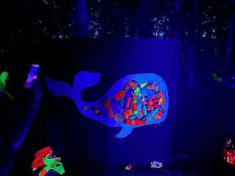 Um den Neon-Effekt zu erzielen, setzten sie fluoreszierende Acrylfarben und Graffiti-Sprühfarben ein: ein langer Schaffensprozess, der sich lohnen sollte. „Für viele war die Erfahrung, ein dreidimensionales Kunstwerk zu gestalten und schließlich öffentlich auszustellen, völlig neu“, musste Dorothee Becker feststellen.