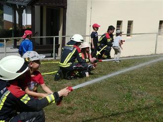 Direkt am Nachmittag erwartete die Riesen bereits die nächste Überraschung. Die Feuerwehr Weiler kam mit Blaulicht und Martinshorn auf den Hof gefahren, um den Kindern etwas über ihre Aufgaben und ihre Arbeit zu erklären. Danach durften die Kinder im Feuerwehrauto Platz nehmen und sich die gesamte Ausrüstung im Auto ansehen. Ihnen wurde genau erklärt, was für die verschiedenen Einsätze benötigt wird und wie alles funktioniert. Das Highlight kam natürlich zum Abschluss, als die Feuerwehrmänner mit den Kindern eine Übung nachstellten und die Kinder in verschiedenen Trupps Vorbereitungen und Aufgaben zum Löschen übernehmen durften. Als die Wasserversorgung aufgebaut war, durften alle Riesen mit den Schläuchen und Spritzen die Wiese und Büsche „löschen“.