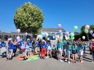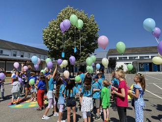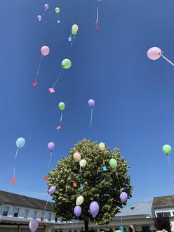 Wieder in der Schule angelangt, warteten schon die anderen acht Klassen und alle Lehrkräfte auf die Gesegneten und verabschiedeten sie mit dem gemeinsamen Schullied „Wir sagen euch Tschüss“. Die Viertklässler hatten im Vorhinein Karten mit Wünschen gestaltet, die an Luftballons befestigt zu dem Lied „99 Luftballons“ in den Himmel steigen gelassen wurden.