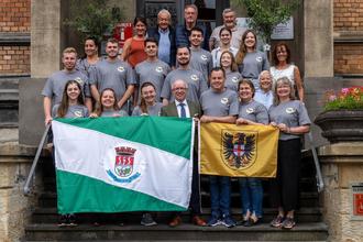 Stadt Boppard - Die Jugenddelegation gemeinsam mit Boppards Bürgermeister Jörg Haseneier, Vertretern der Stadtverwaltung und des Freundeskreises Arroio do Meio - Boppard beim Empfang vor dem Alten Rathaus in Boppard.