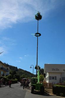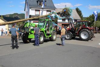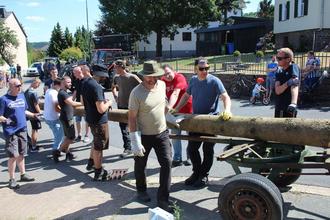 Am Samstagmorgen machte sich die Kirmesjugend auf den Weg in den Wald, um bei strahlendem Sonnenschein und sommerlichen Temperaturen den diesjährigen Kirmesbaum ins Dorf zu holen. Kurz nach 14 Uhr war es soweit, mit einem Hupkonzert kamen die Jugendlichen und Junggebliebenen samt 18m Baum in den Ort zurück. Nach einer kurzen Stärkung ging es ans Baumschmücken, bevor die Stellaktion stattfinden konnte.