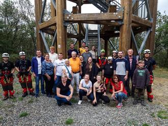 Anschließend wanderte die Gruppe zum Aussichtsturm „Fünfseenblick“. Dort wartete bereits die Höhenrettungsgruppe der Freiwilligen Feuerwehr Boppard auf sie, um ihr Können unter Beweis zu stellen. Abseilen vom Turm stand auf dem Programm. Nachdem die brasilianische Delegationsleiterin mutig vorgegangen war, mussten auch die Jugendlichen und ihre Gastgeber ihre Höhenangst überwinden und über das Geländer den Schritt in die Tiefe wagen.