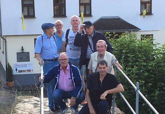 Nach einer guten Stärkung wurde das Gruppenbild aufgenommen (im Foto fehlt der Fotograf Klemens Daum) und danach die begehbare Stadtmauser ab dem Plan neben der Eisenbahnstrecke entlang bis zum Schaarplatz begangen.