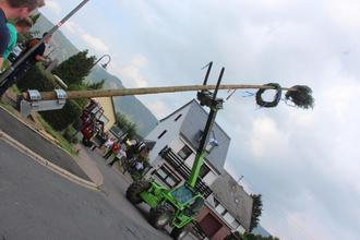 Unter mehreren Haurucks und einigen Stemmaktionen wurde der Baum in eine Vorrichtung gehievt und Stück für Stück mit Hilfe von zwei Traktoren Richtung Himmel aufgestellt. Unter lang anhaltendem Applaus wurde damit die Weilerer St. Peter Kirmes feierlich eröffnet und dem Fassanstich stand nichts mehr im Wege.