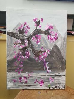 Der dritte Tag stand im Zeichen der freien Kunst: Ein abstraktes Fantasiebild entstand, bei dem Formen, Farben und Ideen ganz individuell kombiniert werden durften. Besonders stimmungsvoll wurde es am vierten Tag, als die Kinder zarte Kirschblütenzweige in Anlehnung an die japanische Maltradition malten. Zum krönenden Abschluss des Kurses zauberten die jungen Künstlerinnen und Künstler mit Kaffeesatz ganz besondere Werke – eine kreative und duftende Überraschung.