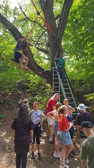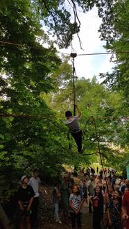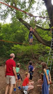 Mit diesen Worten kam ein zukünftiger Fünftklässler wieder am Ausgangspunkt an. In Kooperation mit Martin Rink baute die JugendBegegnungsStätte (JBS) St. Michael oberhalb der Großsporthalle eine 30m lange und bis zu fünf Meter hohe Seilquerung im Rahmen des Projektpräsentationstags der Fritz-Straßmann-Realschule+ auf.