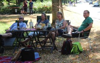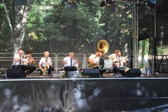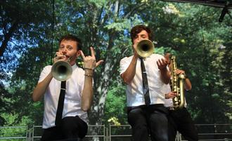Die Band Bandakadabra aus Italien gastierte mit ihrem Programm „OK Boomer“. Von Daft Punk bis Billie Eilish, über Bruno Mars und Radiohead, sie spielt Neuinterpretationen beliebter und bekannter Hits im Dixie- und Swingstil. Und das macht die Band mit großem Spektakel und viel Dampf. Immer wieder wird das Publikum ins Programm mit eingebaut, und das hat sichtlich Spaß dabei. So wird, besonders den jungen Besuchern, ein zeitloser Sound des Old Time Swing & Jazz näher gebracht. Für die etwas älteren Jazz-Freunde, neueste Pop-Produktionen in einem anderen, besonderen Gewand gespielt. Verschiedene Generationen werden durch Musik verbunden, was will man mehr beim Picknick im Park für die ganze Familie. Kleine Wermutstropfen gab es jedoch auch. Wenn Italiener der englischen Sprache ihren heimatlichen Touch geben, sind sie nur schwer zu verstehen. Zudem fiel mit etwa 90 Minuten das Konzert, vorwiegend vor der Bühne stattfindend, recht kurz aus. Headsets und eine entsprechende Bühnentechnik für die Musiker sowie eine entsprechende Abmoderation hätten allen Beteiligten gut getan.