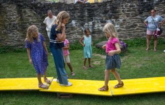 In der Burg wartete der Ritter "Boos von Waldeck" und erzählte die Geschichte, wie er vor vielen hundert Jahren bei einer Wette einen Stiefel mit Wein austrank und so eine Stadt gewann. Prompt mussten die Kinder gemeinsam einen Stiefel (Apfelschorle) leeren und wurden mit Goldmünzen belohnt. Ein leckeres Eis, gestiftet von Eissalon Toscani, rundete den schönen Tag ab.