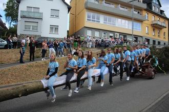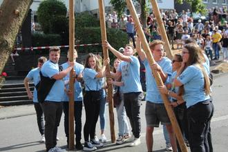 Zahlreiche ehemalige Kirmesjahrgänge ließen es sich nicht nehmen, den Jahrgang beim Aufstellen des Baumes stimmungsvoll zu unterstützen. Als der Baum dann sicher verankert war, schlug die Stunde von Jennifer Puth vom Kirmesjahrgang.