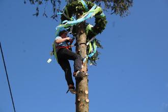 Sie kletterte mit Steigeisen und am Seil gesichert der Kirmesspitze entgegen, um die Sicherungsseile in über 20 Meter Höhe zu lösen. Mit dem Kirmesspruch: „Wem gehört die Kirmes?“ war die Salziger Kirmes dann auch offiziell eröffnet.