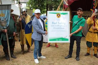 BAD SALZIG. (EF) Im Rahmen der 1100 Jahrfeier Bad Salzig, fand anlässlich des Ortsjubiläums und der Kirmes im herrlichen Ambiente des Kurparks ein Mittelalter Markt statt. Bürgermeister Jörg Haseneier ließ es nicht nehmen, die besten Wünsche zu überbringen und den Markt feierlich zu eröffnen. Unter dem Motto „Salzig Anno 922“ war dies auch zugleich der Höhepunkt der Feierlichkeiten im Jubiläumsjahr.