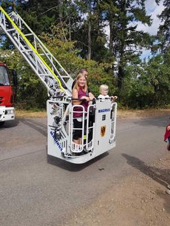 „Tatütata“: im großen Korb der Drehleiter der Feuerwehr bestaunten die Kinder aus luftiger Höhe ihre Kameraden beim Armbrustschießen an der Drachenburg, beim Stockbrotbacken oder beim Tollen auf der Hüpfburg.