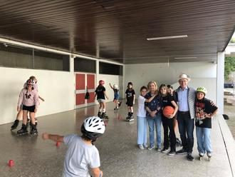 Teilnehmerinnen und Teilnehmer der Sommerferienaktion mit Bürgermeister Jörg Haseneier neben dem Parcours der Inlineskater.