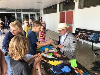 Arthur erklärt dem Bürgermeister sein Bastelwerk, das bei der Sommerferienaktion entstanden ist.