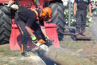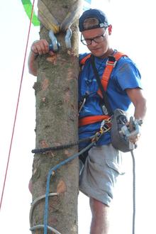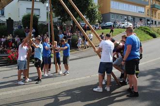 Als der Baum sicher verankert war, schlug die Stunde von Miguel Pies vom Kirmesjahrgang. Der kletterte mit Steigeisen und am Seil gesichert der Kirmesspitze entgegen, um die Sicherungsseile zu lösen. Mit dem Kirmesspruch: „Wem gehürt die Kermes?“, war die Salziger Kirmes dann auch offiziell eröffnet und es ging zum Fassanstich auf den Kirmesplatz.