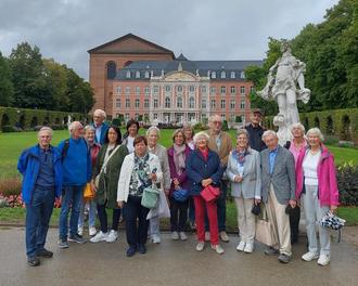 Die VHS-Gruppe mit Reiseleiter Heinz Bengart im Palastgarten auf dem Weg zur Weinwirtschaft Friedrich-Wilhelm, die vom früheren Bopparder Alexander Rinke betrieben wird. Im Hintergrund links die Konstantinbasilika, erstmals um das Jahr 310 erbaut, und rechts das Kurfürstliche Palais.