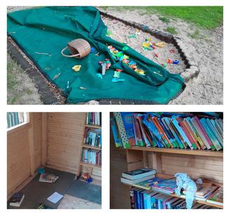 Umso ärgerlicher ist es zu sehen, wie die Spielgeräte am Gemeindehaus hinterlassen werden. Die Sandförmchen werden in letzter Zeit kaum noch zurück ins das Spielhaus gestellt und sind wild auf dem gesamten Platz verteilt. Auch das offene Bücherregal ist leider in einem chaotischen Zustand.