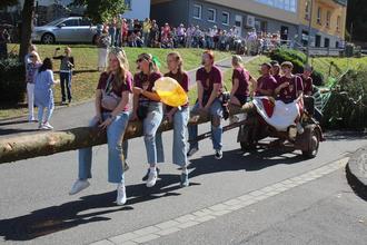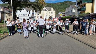 Einige Stunden später fuhr man mit Baum, Trillerpfeife und Gesang Richtung Heimatort. Hier angekommen, gab es eine kurze Verschnaufpause mit der dazugehörenden Stärkung. Unter den Klängen des Fanfarenzuges Grün Weiß Bad Salzig wurden der herrlich geschmückte Baum und der diesjährige Kirmesjahrgang musikalisch auf den Theodor-Hoffmann-Platz geleitet. Hier konnten die Besucher sich am „Hachenburger Durstlöscher“ bei einem kühlen Bier auf die bevorstehende Kirmes einstimmen.