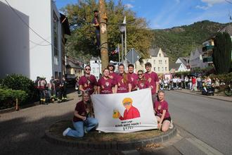 Unter Sicherung der Freiwilligen Feuerwehr Bad Salzig, mit Stützen, per Frauen- und Manneskraft hievte man die Baumspitze ihrem höchsten Punkt Stück für Stück entgegen. Zahlreiche ehemalige Kirmesjahrgänge ließen es sich auch diesmal nicht nehmen, den Jahrgang beim Aufstellen des Baumes stimmungsvoll zu unterstützen. Allen voran der mittlerweile legendäre Jahrgang 1958/59.