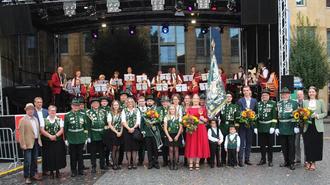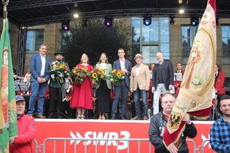 Bürgermeister Jörg Haseneier; die Weinmajestäten Carina (Weinprinzessin), Ada (Weinkönigin) und Bacchus Felix; Ortsvorsteher Niko Neuser; TI-Leiter Stefan Rees sowie Diözesan-Schützenkönig Alexander Sablozki eröffneten unter den Klängen des Mittelrheinischen Jugendblasorchesters nach ihrem Kutschenausstieg, umrahmt von den Fahnenabordnungen der Nachbarschaften und dem Bopparder Schützenverein, die Weintage. Tradition trifft Heimat, eine tolle Symbiose gleich zu Beginn des Weinmarkttreibens. Im Anschluss heizte DJ Josh Kochhann mit der SWR 3 Party den Besuchern mächtig ein.