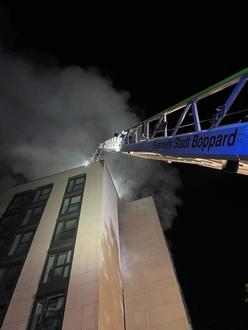 Beim Eintreffen der Feuerwehr drang bereits dichter schwarzer Qualm aus dem im Bau befindlichen Gebäudekomplex. Sofort wurde die Alarmstufe auf „B3 Sonderobjekt“ erhöht. Somit alarmierte man die Feuerwehren aus Weiler, Hirzenach, Boppard und Buchholz so wie den GW Atemschutz aus Simmern zur Unterstützung, die Feuerwehr Oberwesel als Teileinheit des Gefahrstoffzuges zur Luftmessung.