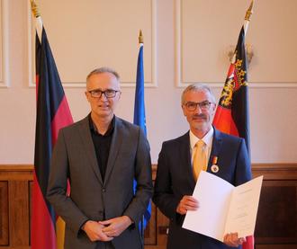 Prof. Dr. Martin Kaschny, Vizepräsident der Struktur- und Genehmigungsdirektion (SGD) Nord (links), händigte die Verdienstmedaille des Landes Rheinland-Pfalz an Rainer Bersch aus Boppard (rechts) aus.