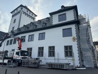 Zunächst war Fachunternehmen damit beschäftigt, Baugerüste an der Rheinseite und der Westseite der Kurfürstlichen Burg aufzustellen. Die nun folgenden Sanierungsarbeiten sollen, abhängig von der Wetterlage, bis Ende November 2024 abgeschlossen sein.