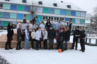 Wer sich jedoch bewege, müsse auch ruhen. Sportlehrer Ralf Schall (oben, rechts) freut sich mit Hausmeister Dietmar Rosenbach (oben: 2.v.r.), Schülersprecherin Savina Eschenauer (oben: 3.v.r.) und Förderkreisvorsitzende Christiane Fischbach (unten: 4.v.r.) über die Umsetzung. Für den Schulbetrieb freigegeben werde das Bauwerk in Kürze.