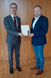 Abteilungsleiter Dr. Müller-Ehlen überreicht die Medaille an Johannes Link