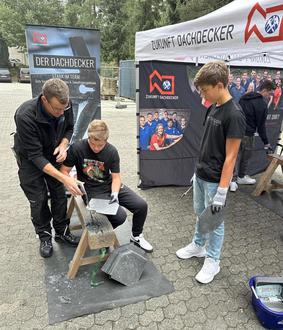 Zahlreiche Betriebe wie Westnetz oder die Polizei kamen auch mit ehemaligen Schülern der Oberweseler Realschule. Dabei kamen oft auch praktische Einblicke nicht zu kurz, wie zum Beispiel bei Vertretern der Dachdecker-Innung und der Bad Kreuznacher Diakonie, die mit zahlreichen Übungsstationen bei den Schülerinnen und Schülern punkteten.