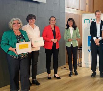 (vlnr): Christiane Huber, MINT Zukunft schaffen e.V.; Claudia Werum, TGA-Planpartner und VDI e.V.; Bildungsministerin Dr. Stefanie Hubig; Lada Helle, Fritz-Strassmann-Schule