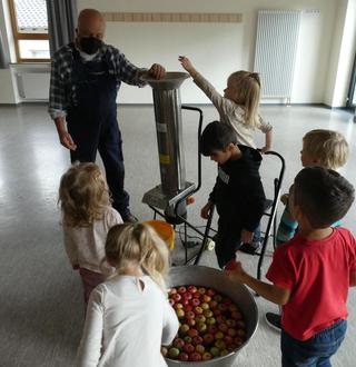 Außerdem haben auch in diesem Jahr Erika und Horst Minning im Zuge der Zusammenarbeit mit dem Naturschutzbund die Kita besucht, um mit den Kindern eigenen Apfelsaft herzustellen. Einen ganzen Tag lang wurden Äpfel gepresst und Saft hergestellt. Die Kinder halfen beim Waschen, Zerkleinern und Apfelpressen aktiv mit. Nachdem der Saft sterilisiert wurde, um so haltbarer zu sein, haben die Kita-Kinder nun einen leckeren Apfelsaftvorrat für die nächste Zeit. „Es hat sehr viel Spaß gemacht, und wir bedanken uns herzlich bei Familie Minning, dass sie uns dies wieder ermöglichen konnte“, lautete das Fazit aller Beteiligten.